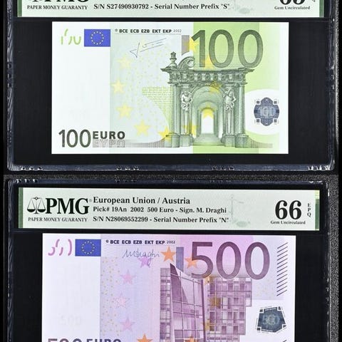 Set på fem euro-noter: tre 5-euro og to 10-euro, udstedt 2002/2005 med Duisenberg J001/J003, forsynet med certifikat. Klik på den blå "gå til varen" knap, for at købe eller byde på denne vare. Den samlede pris vil blive vist inden du afgiver dit bud.
