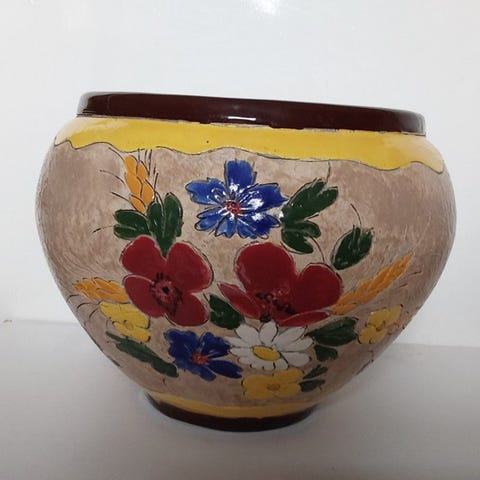 Cachepotet har levende garlands af roser og vilde blomster, omhyggeligt malet på helt hvidt porcelæn. Et kronet monogram 'LP', som angiver Kong Louis-Philippe, er fremtrædende vist i orange-rød, hvilket giver en kongelig præg.