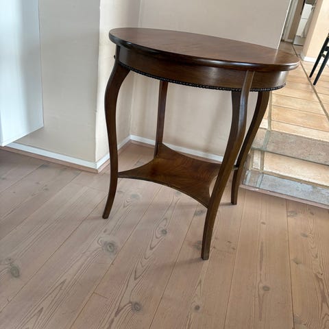 Den runde top er udført med en smuk valnøddetræsfinér i midten, omgivet af en kontrasterende kant og en subtil indlagt bies. Den livlige åretegning og den symmetriske spejling giver toppen dybde og karakter. Den varme, satinagtige lak fremhæver træets naturlige nuancer og skaber et rigt udtryk.