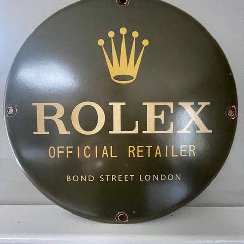 Rund emajle Rolex Submariner-plade i grøn med krone-logo og Submariner-tekst; original/officiel vare, fremstillet i Frankrig, i god stand med lidt slid og pletter fra alder, cirka 30 cm i diameter, vægt 900 g. Klik på den blå "gå til varen" knap, for at købe eller byde på denne vare. Den samlede pris vil blive vist inden du afgiver dit bud.