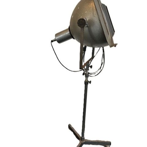 Det drejer sig om en helt gammel 2KW lampe (2000 watt), lampen er fuldstændig original og funktionel. Fresnel-linse, originalt tænd/sluk-kontakt, lang tyk kabel og spot-funktion; alt er til stede.