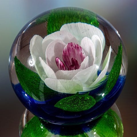 Kugleform. Brevkuglen viser i midten en meget stor luftperle, som er omgivet af fire bladlignende formationer og minder om en abstrakt blomst. Underneden ses et spindelvæv af tynde glasfibre, der er gennemsyret af gyldne perler. Genstandene svæver over en sort-hvid marmoreret