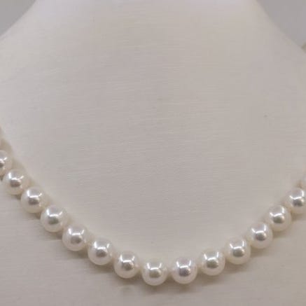 En smuk perlekæde af hvide saltvands-AA Akoya-perler med enestående glans, afsluttet med et solidt sølvkugle-lås.