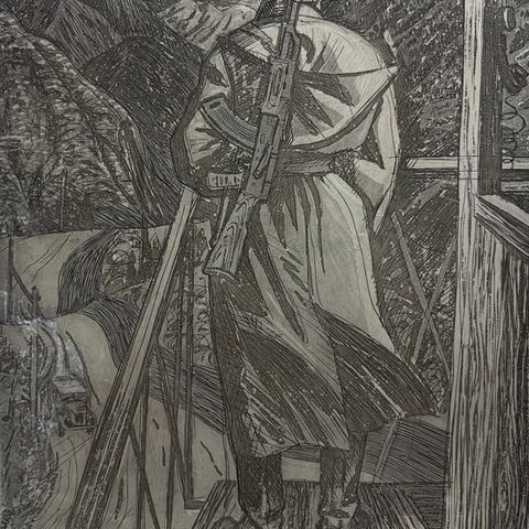 Scenen præsenterer en dramatisk multi-figur fortælling: soldater, civile, artillerikanon, optrukket kavaleri og symbolsk flaggbillede. Kompositionen udføres med stærk ekspressiv korsskygning, markante lineære kontraster og dynamisk barbering – typisk for sovjetisk grafisk kunst fra midten af det 20. århundrede forbundet med krigstidens publikationer og