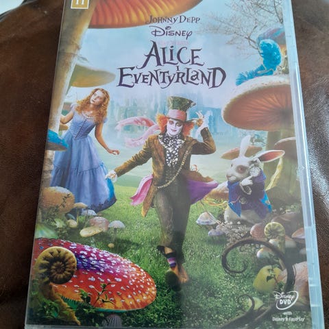 Disney Alice i Eventyrland DVD. Filmen er udgivet på DVD og er en spillefilm baseret på historien om Alice i Eventyrland. Omslaget viser hovedpersonerne fra filmen og angiver, at der er to versioner inkluderet. Velegnet til afspilning på standard DVD-afspillere, der understøtter formatet.