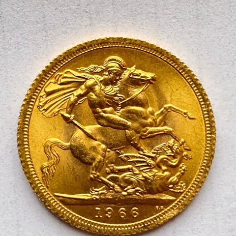 Storbritannien guld sovéran fra 1918 med George V, restrike MOM 21, vægt 8,01 g guld, ugraderet. Klik på den blå "gå til varen" knap, for at købe eller byde på denne vare. Den samlede pris vil blive vist inden du afgiver dit bud.
