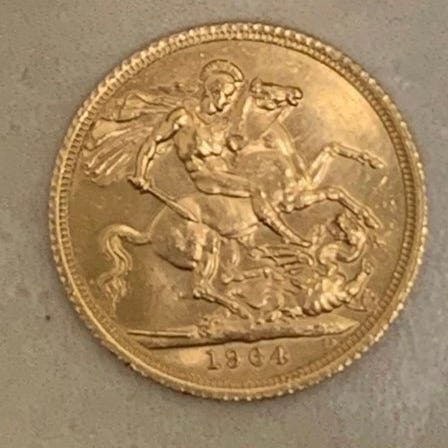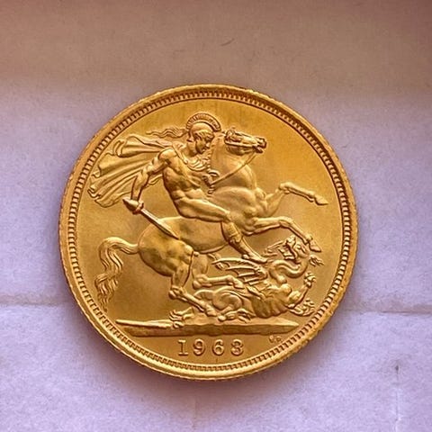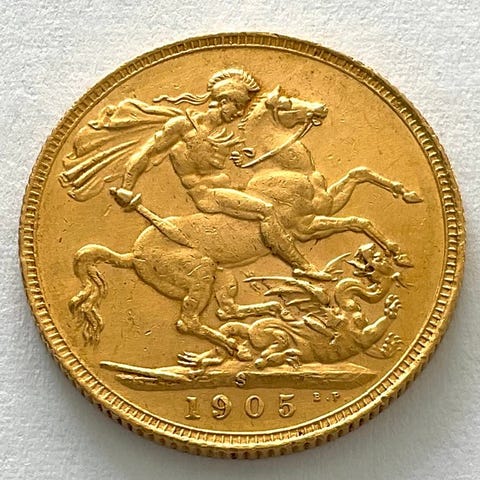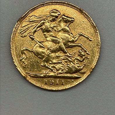 STORBRITANNIEN. Suverænemønt i gyldent guld Georges, 1918. Bærer indskriften "MOM 21". Vægt: 8,01 g
