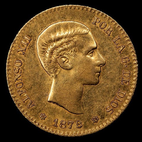 Spansk guldmønt på 20 pesetas af Alfonso XIII, præget i Madrid (MPM) i 1890, vægt 6,46 g, diameter 21,24 mm, i ikke-certificeret tilstand. Klik på den blå "gå til varen" knap, for at købe eller byde på denne vare. Den samlede pris vil blive vist inden du afgiver dit bud.