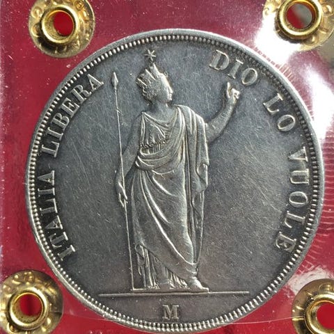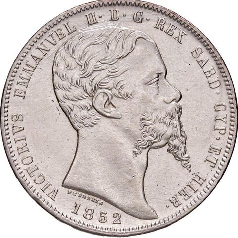 Jeg sælger to smukke 5-lire mønter fra 1844, fra Torino- og Genova-mynterierne (sjældne), præget under Karl Alberto i Kongeriget Sardinien. 25 g hver af sølv 0,900; den Torino-mønt er vurderet til BB/SPL, mens den anden er uden vurdering (efter min mening BB/BB+). Jeg sender ikke uden for EU.