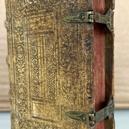 Godt. To små mærkater på ryggen, noget læder tabt i foden af ryggen, læder tabt ved toppen af ryggen. Tabs i nederste hjørne af forbladet foran. Inderskarnieret lidt åbent samt indvendig margen enkelte