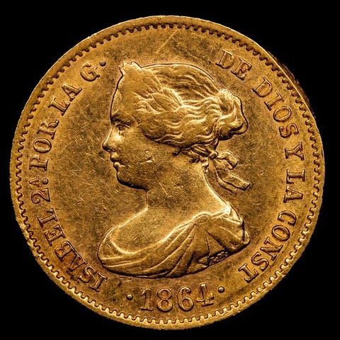 Spansk guldmønt fra Isabel II-tiden, 4 Escudos, præget i Madrid i 1867, vægt 3,35 g og diameter 17,98 mm, i konservationsstatus uden certifikat. Klik på den blå "gå til varen" knap, for at købe eller byde på denne vare. Den samlede pris vil blive vist inden du afgiver dit bud.