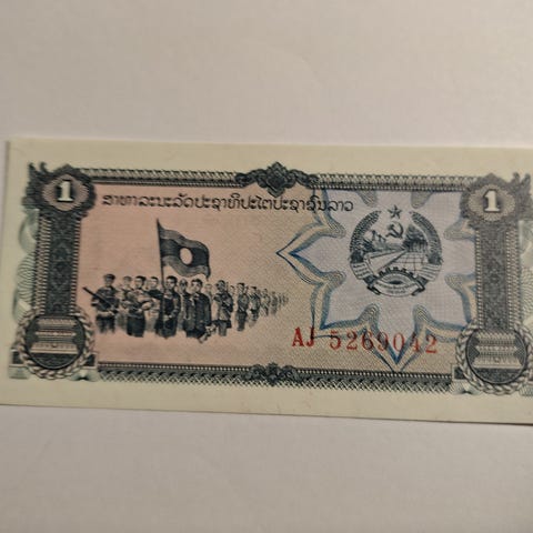 Moneda de aluminio con orificio central emitida en los primeros años del Reino de Laos, de estilo simbólico y depurado. El anverso presenta un monumento ceremonial con rayos radiantes, de relieve claro y composición equilibrada, mientras que el reverso muestra el valor facial flanqueado por una ornamentación vegetal geométrica de inspiración tradicional. El ejemplar conserva brillo original