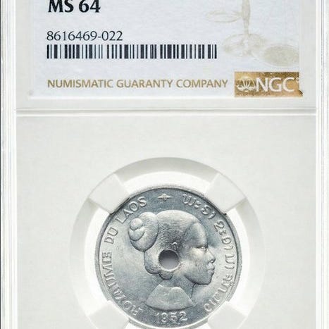 Laos, 1952, aluminium 50 cent i centralt hul, bedømt MS64 af NGC. Klik på den blå "gå til varen" knap, for at købe eller byde på denne vare. Den samlede pris vil blive vist inden du afgiver dit bud.
