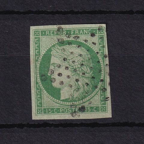 Frankrig, 15-cent Ceres i en sjælden meget mørk grøn nuans, certifikatet Scheller, udgivet 1850, afstemplet, Yvert 2c, katalogværdi €2.800 (Yvert 2024). Klik på den blå "gå til varen" knap, for at købe eller byde på denne vare. Den samlede pris vil blive vist inden du afgiver dit bud.