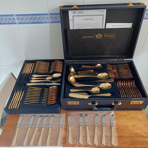 Gammelt 70-delt bestik med lækker mønster i original og nyt læderkuffert, bestående af 70 dele - se billeder, de er en del af auktionen, bagsiden graveret med *23/24 karat hårforgyldt*, Producentfirma SBS et herligt konvolut, oprindelsesland Tyskland/Solingen, Alder fra 14.8.85 ifølge faktura, købspris var 2298 DM, næsten 1200 Euro, det var en gave til vores mor, derfor er prisen og datoen kendt, tilstand ubrugt/nylig, kun liggespor, samlet vægt ca. 6,4 kg.