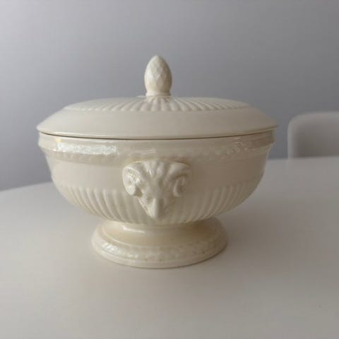 Pragtfuld sjælden smørform med fast fod fra Wedgwood-serviset Edme. Det ikoniske og klassiske, tidløse design fra Wedgwood, med fint reliefribbet dekor og smukt cremehvidt glasur.