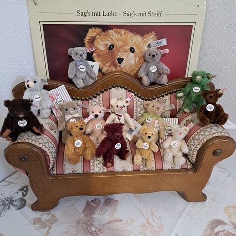Smuk Steiff-teddy, specielt lavet til Märklin og det tyske Togmuseum. Fremstillet i 2000. Begravnet udgave på 2000 styk, dette er nummer 487. Lavet af lyst mohair og filtjakke. God stand. Kommer med æske og certifikat, bjørnen i næsten ny tilstand. Æsken i beskadiget tilstand.