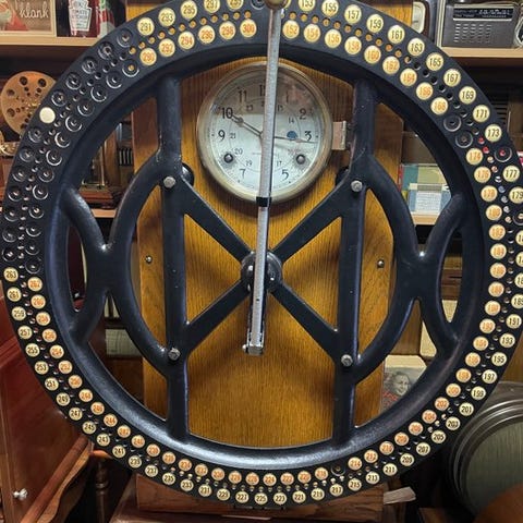 Mekanisk tidsregistreringsur (prikklok) fra Blick Time Recorders Ltd., London. Denne type klok blev brugt i fabrikker og kontorer til at registrere arbejdstiden.