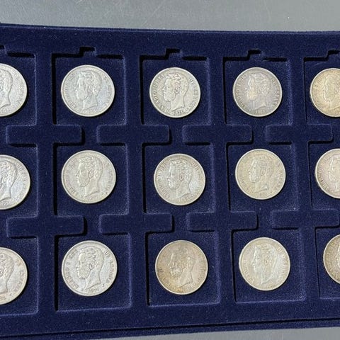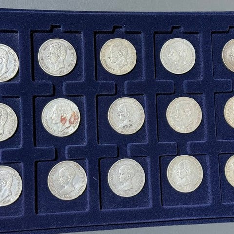 Fire spanske sølvmønter, finhed 900, samlet vægt 99,40 g, med Alfonso XII (tre mønter fra 1877–78) og Alfonso XIII (1889), tilstand uden certifikat. Klik på den blå "gå til varen" knap, for at købe eller byde på denne vare. Den samlede pris vil blive vist inden du afgiver dit bud.