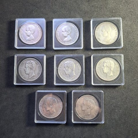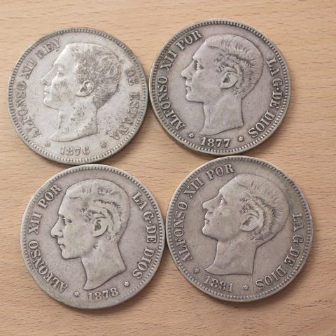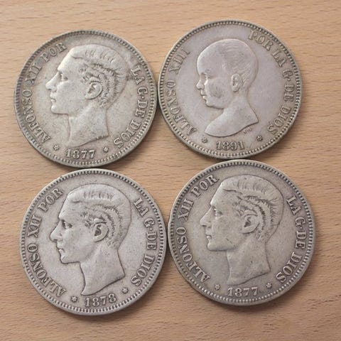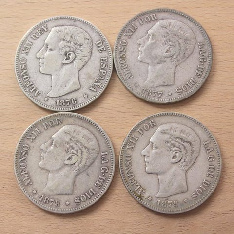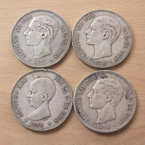 Spanien. Alfonso XII. 5 Pesetas 1877 - 1889 (4 monedas)
