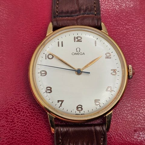 Omega Tresor Jumbo i 14K guld, reference 14715-61, kasse 34 mm, håndoptrukket cal.268 bevægelse, sort guilloché visning, lang læderrem, original æske inkluderet, ingen originale papirer eller garanti, år 1961, stand Virtue God med mindre brugsspor, netop serviceeret 02/2026. Klik på den blå "gå til varen" knap, for at købe eller byde på denne vare. Den samlede pris vil blive vist inden du afgiver dit bud.