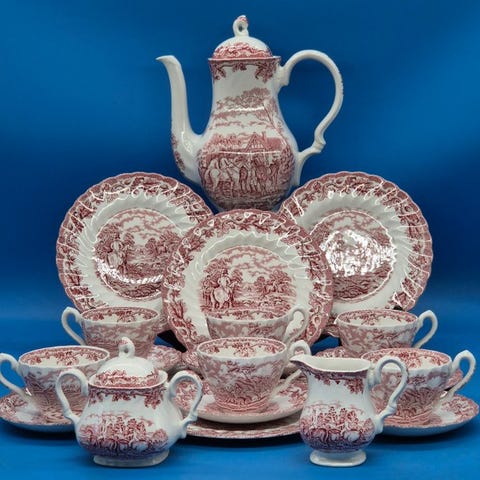 til salg står et klassisk kaffeservice fra den engelske manufaktur Myotts fra Staffordshire. Servicen viser det velkendte dekor „Country Life“ med fint udførte landlige jagt- og landskabsscener i rødt transfertryk på cremefarvet keramik.