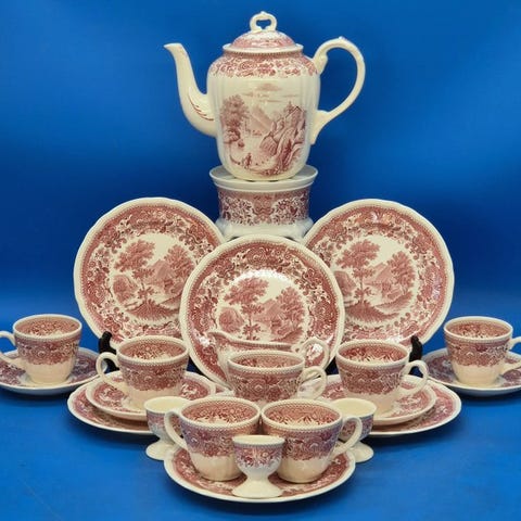 til salg er et højkvalitets porcelæns-ensemble fra mærket Villeroy & Boch fra Mettlach, serie „Burgenland“ med karakteristisk kobberstik underglasurdekor. Den traditionelt udførte udformning imponerer med detaljeret ornamentik og klassisk formgivning.
