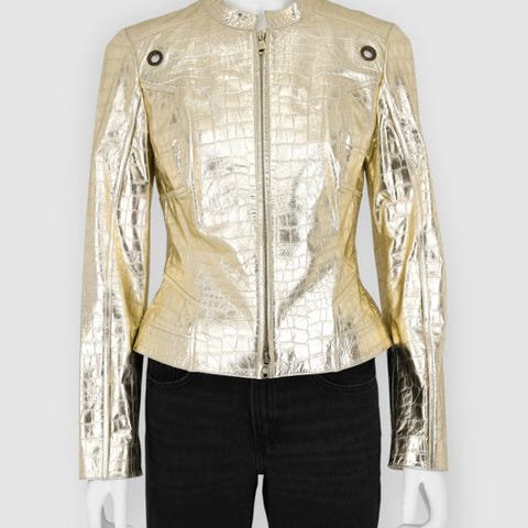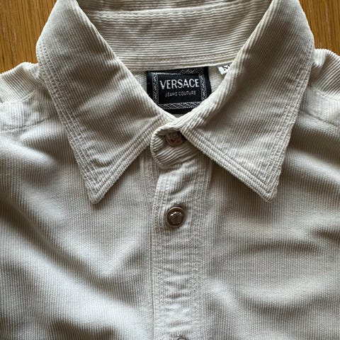 Klassiske detaljer inkluderer en spids krave, skjult knaphul med guldfarvede knapper, knapper på manchetterne og en afslappet men skræddersyet silhuet typisk for Versaces