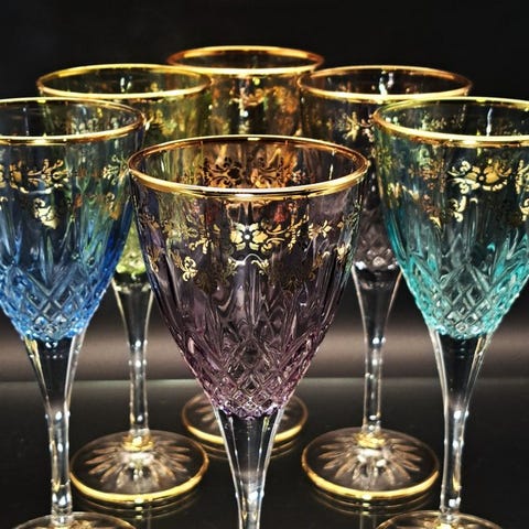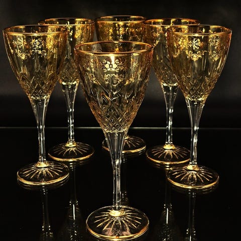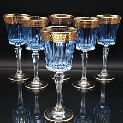 Artemisia: 6 vinglas af krystal af høj kvalitet dekorert med blondeeffekt i 24 kt guld, blå farve.