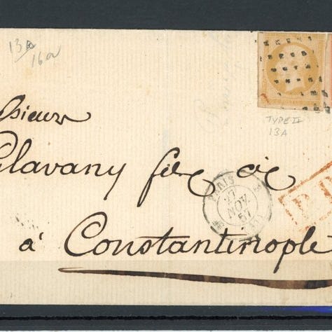 Sjælden breve med to par obliterationer med små tal og Moseile-kassestempel, oprindelse: Frankrig, dateret 1870, tilstand: oblitred. Klik på den blå "gå til varen" knap, for at købe eller byde på denne vare. Den samlede pris vil blive vist inden du afgiver dit bud.