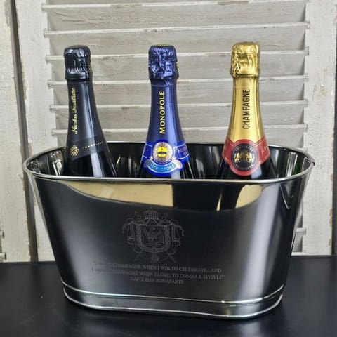 Stor nikkelbelagt skål i oval form til champagne- eller vinglas med indgraveret tekst fra Lily Bollinger og Napoleon Bonaparte på to sider.
