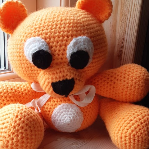 Hæklet bamse i blå garn med store broderede øjne i hvid og sort. Figuren består af to runde dele oven på hinanden og små kugler omkring halsen. Velegnet som pynt eller som blød legetøjsfigur til børn under opsyn. Materiale er garn/tekstil, fyldt med blødt fyld. Ingen løse plastdele ses på billederne.