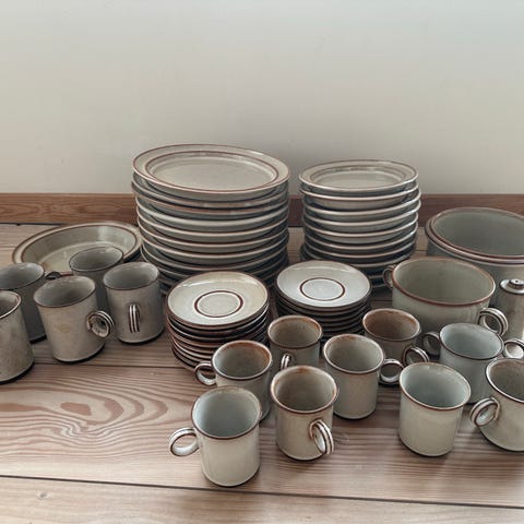 Stogo, stentøj. 11 kaffekopper m/underkopper, 2 tekopper m/8 underkopper, sukkerskål og flødekande, 2 lysestager. Få afslag på to af kaffekopperne og den ene lysestage (se billeder).