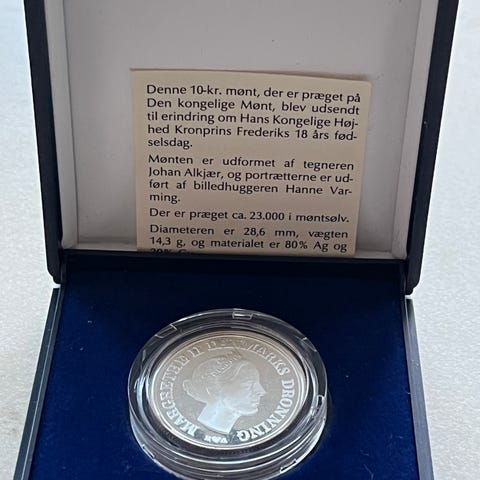 Denne 10 kr. mønt, der er præget på Den Kongelige Mønt, blev udsendt til erindring om H.K.H. Kronprins