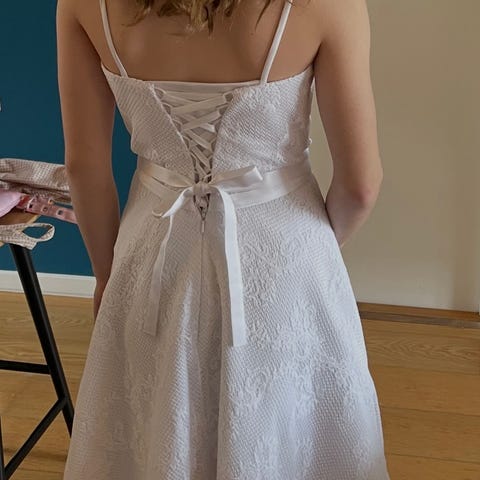 Konfirmationskjole i hvid i str. 36. Kjolen har blondetop med gennemsigtige skulderstropper og blondeapplikationer øverst. Overdelen har korsage-lukning på ryggen med snøre, så pasformen kan justeres. Nederdelen er let og lagdelt med fald i chiffonlignende materiale. I taljen ses et aftageligt bælte med sten/detaljer på nogle af billederne. 100% Bomuldsfor, bælte medfølger. Lilly-model, Nypris: 2200kr. Som ny, er renset, brugt 1 gang.