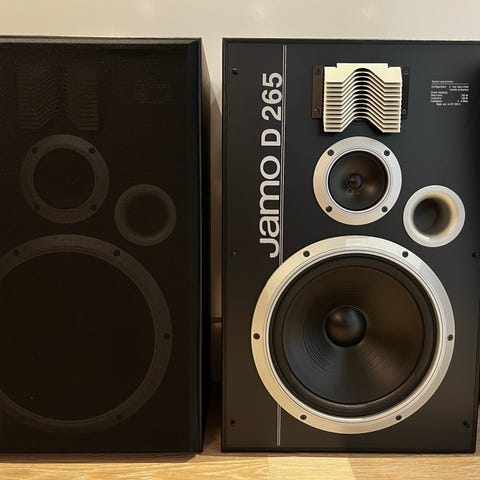 Jamo D 365 højtalere i sort kabinet. Bagsiden angiver en langtidseffekt på 200 W og korttidseffekt på 345 W samt en impedans på 4-8 ohm i henhold til IEC 268-5. Højtalerne har frontmonterede enheder med stor basenhed, mellemtone og diskant samt tilslutning via skrue-/bananbøsninger på bagsiden. Velegnet til brug i stereo- eller hjemmebioanlæg med passende forstærker.
