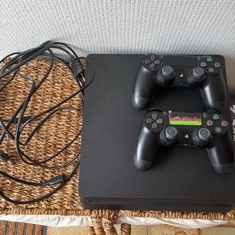 Sony Playstation 4 konsol i sort. Standard PS4-model med tilhørende controller som ses på billedet. Konsollen er egnet til afspilning af PS4-spil på fysisk disk og digitalt. På billederne fremgår flere spil, blandt andet sportsspil og action-/skydespil, som illustrerer kompatible titler til systemet. Velegnet til brug med HDMI-kompatibel skærm eller tv og kræver strømtilslutning samt internetforbindelse for onlinefunktioner.