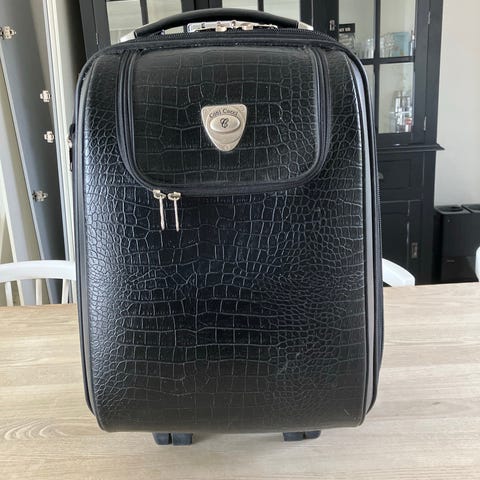 kabinekuffert på hjul. Kufferten er udført i et mørkt tekstilmateriale og har 4 hjul samt teleskophåndtag og bærehåndtag foroven. Udvendigt er der en lynlåslomme til mindre genstande. Indvendigt har kufferten stropper til fastgørelse af indholdet samt foret inderside. Velegnet som håndbagage på flyrejser.