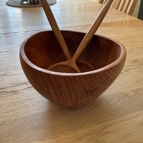 Smukt udskåret salatsæt fra Kenya med håndtag i udskåret ben. Sættet er fra 1980erne eller 1990erne og sælges for 125 kr., som betales kontant eller MobilePay ved afhentning fra adresse.