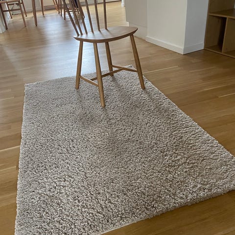 Rugvista løber tæppe i grå nuancer med sort, grafisk mønster med skrift- og stempelmotiver. Tæppet er aflangt og egner sig til gangarealer som entré, gang eller foran køkkenbordet. Overfladen fremstår tæt vævet med kort luv, hvilket gør tæppet nemt at støvsuge og vedligeholde. Velegnet til indendørs brug på hårde gulve som træ, laminat eller fliser.