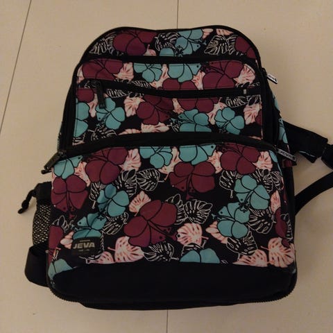 Jeva rygsæk i syntetisk materiale til unisex. Rygsækken har et farverigt, blomstret mønster med overvejende lilla, blå og beige nuancer. Den er udstyret med polstrede, justerbare skulderstropper og polstret ryg for øget komfort. Tasken har et stort hovedrum med lynlås, ekstra rum i toppen samt en frontlomme med lynlås til mindre genstande. Velegnet som hverdagstaske, skoletaske eller til fritidsbrug.
