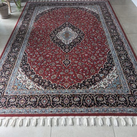 Tæppet på 90 x 60 cm har et detaljeret, orientalsk mønster i lyse og mørke nuancer. Tæppet er købt i 1969’erne, velholdt og uden slidspor