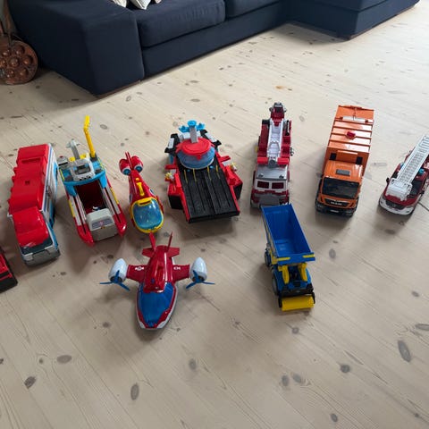 Paw Patrol legetøjsbiler og køretøjer. Sættet består af flere forskellige køretøjer inspireret af figurer og fartøjer fra Paw Patrol-universet, herunder mindre og større biler samt specialkøretøjer. Egnet som legetøj til børn, der kan bruge køretøjerne til rolleleg og genskabelse af scener fra serien. Plastmateriale med forskellige farver og detaljer afhængigt af det enkelte køretøj.