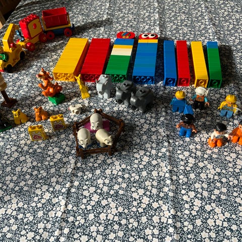 Samling LEGO DUPLO, med senge, figurer, skabe og andet