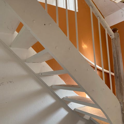 Indendørs trappe i træ med hvidmalet vange og mørke trætrin. Trappen har repos og drejning forneden samt gelænder med mørk håndliste. Velegnet som etageforbindelse i bolig, hvor der ønskes en kombination af malet og hårdt træ. Konstruktionen fremstår som en pladsbesparende løsning med lukkede stødtrin og klassisk udtryk.