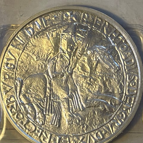 Guldfarvet rektangulær plade med religiøst motiv. Forsiden viser en korsfæstelsesscene med figur på kors omgivet af fugle i relief. Bagsiden har tekst med De Ti Bud samt oplysninger om vægt og indhold præget i metallet. Pladen leveres i klar plastlomme og kan anvendes som samlerobjekt eller dekorativ genstand.