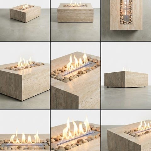 • Materiale: Massiv grå travertin og stel i børstet metal (messing/kobber-finish).