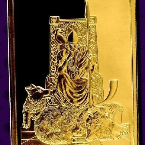 Odin Life Tree samlebars i rektangulær form med motiv af Odin på trone på den ene side og Life Tree-motiv på den anden side. Barren har guldlook overflade og leveres i gennemsigtig plastkapsel. Velegnet som samlerobjekt eller dekoration.