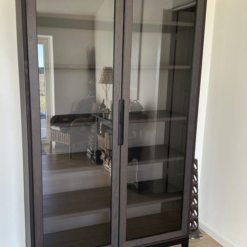 Kun stået et halvt år, ingen slid, vi har ikke sat de midterste hængsler på, da man selv skal lave hul og vi vidste vi ville sælge det, da det var et fejlkøb og at sende det retur med glaslåger turde vi ikke. På vores billeder kan man ane, at lågerne ikke sidde helt lige, men tænker det vil rette sig helt, når de sidste hængsler kommer på.