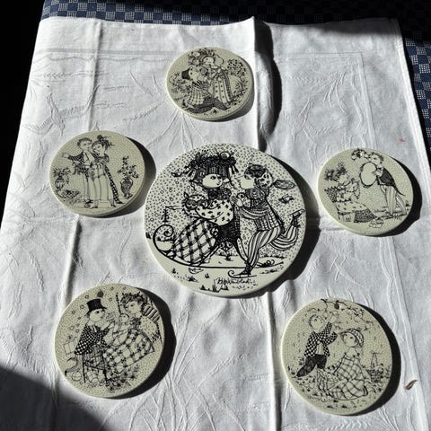 Bjørn Wiinblad platter/smørebrikker. Hele og fine. 9 stk af den sorte model på 15 cm. 1 stk af den røde model på 15 cm.